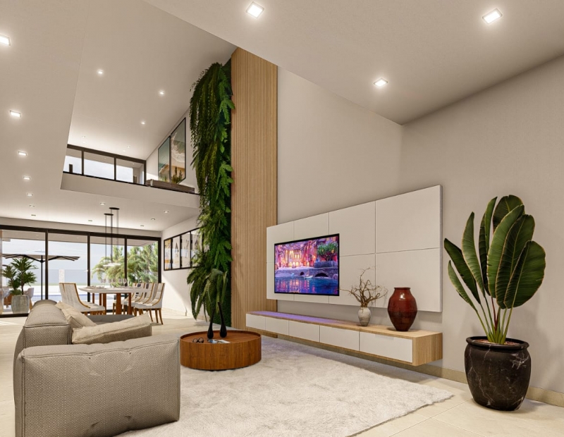 Sala de estar com vista privilegiada para o mar.