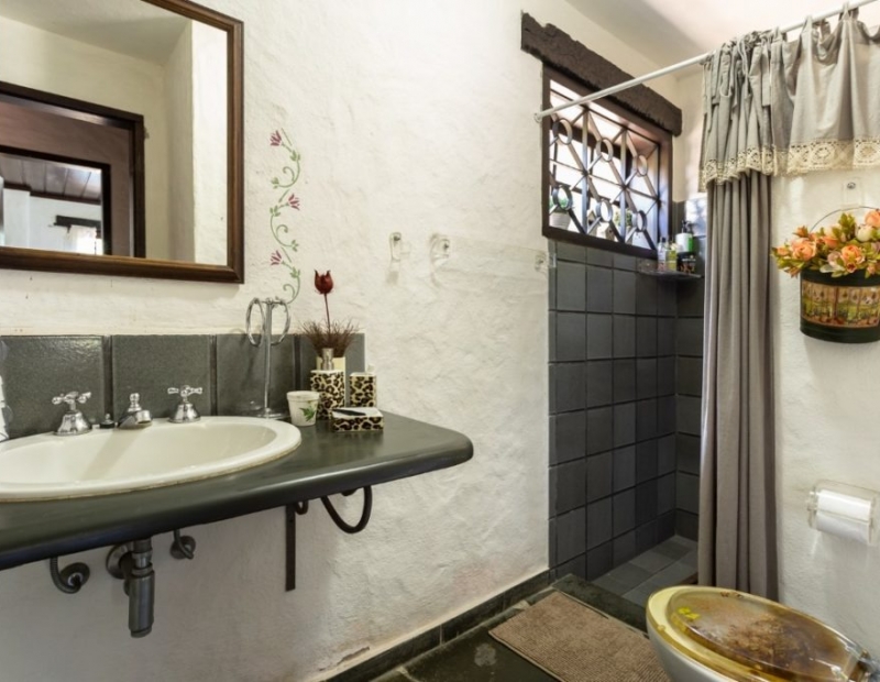 Casa principal com dois pisos, totalizando 350m², composta por 1 suíte e 3 dormitórios, todos com ar-condicionado e guarda-roupa embutido, 3 wc, sala de estar, sala de jantar, sala com lareira. Cozinha completa, área de serviço e garagem para cerca de 8 veículos.